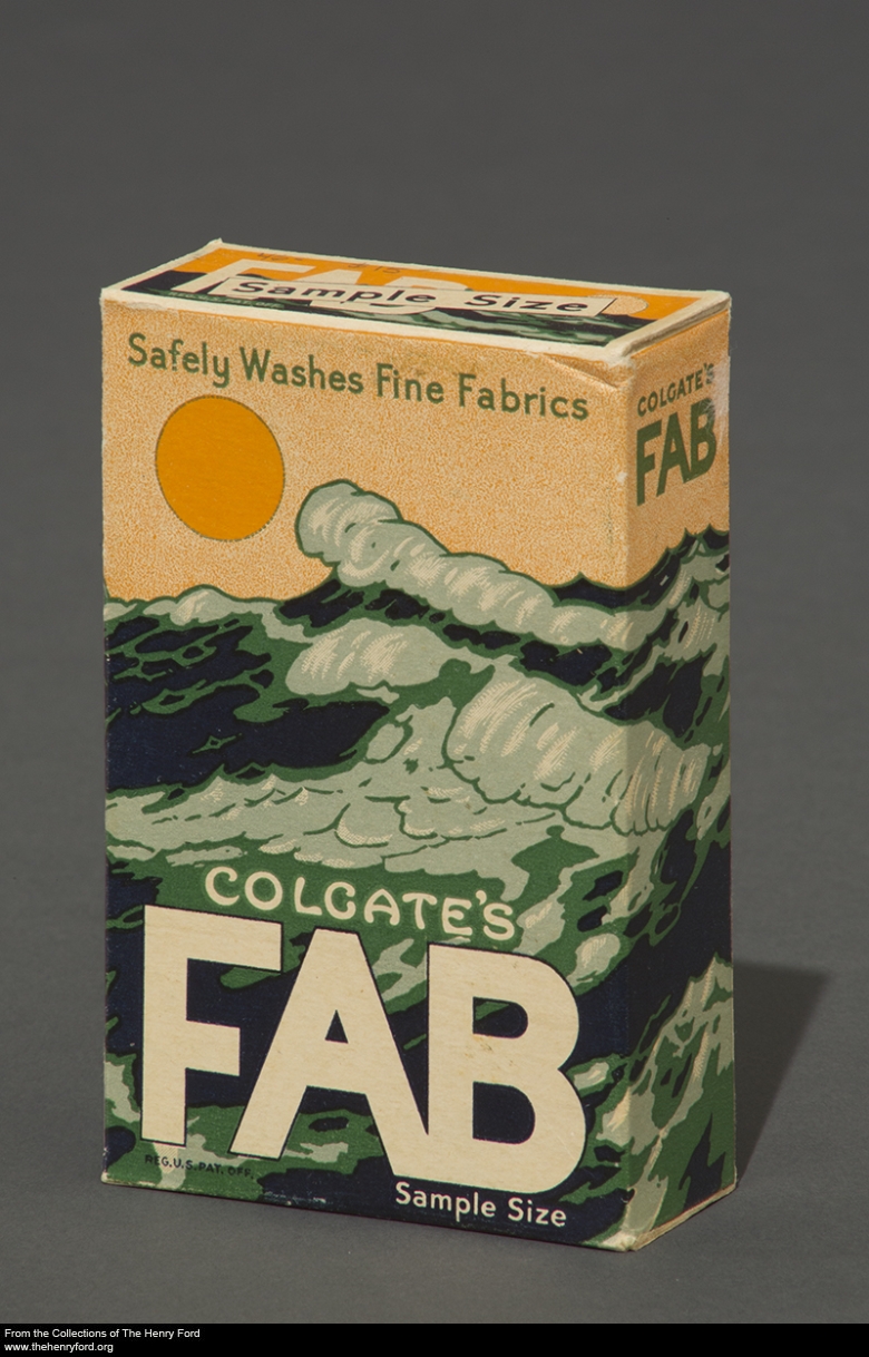 In 2012, Dennis Fiems donated hundreds of laundry and other soap packaging items to The Henry Ford that been collected by his late wife, Susan Strongman Fiems. According to Curator of Public Life Donna Braden, this collection is important as it exemplifies several 20th century trends: the evolution of product packaging, the changing nature of housekeeping and “women’s work,” increasing cultural attention on hygiene, and technological advances in these chemistry-driven products. More than 300 of these items are now digitized and available to browse online, including this sample-size box of FAB soap flakes from the early part of the 20th century. You can see additional items from the Fiems collection (plus other related objects) by visiting The Henry Ford’s collections website and browsing keywords such as soap, laundry products, and even clothespins.