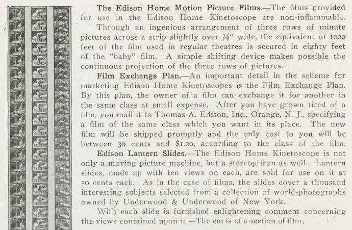 The fact that the companies offered movies for rent was also of considerable appeal to consumers, as was the system of home delivery by mail. In order to accomplish this, both Edison and Pathé established “exchange” hubs to ship and receive their films. Owners of the Home P.K. initially had to purchase a film, which ran in the $2.50 to $20 range ($59-$472 if priced today), and then pay an exchange fee of $0.30-$1 ($7-24 in 2013) when swapping one movie for another. Pathé’s method differed, as Pathescope owners instead paid a yearly subscription of $50-$100 ($1,180-$2,360 today), fees based on how many movies were rented at a time. Edison offered 50 films at launch, a number that grew to 160 by 1914; Pathé had 700 films by that time—a momentous disparity.