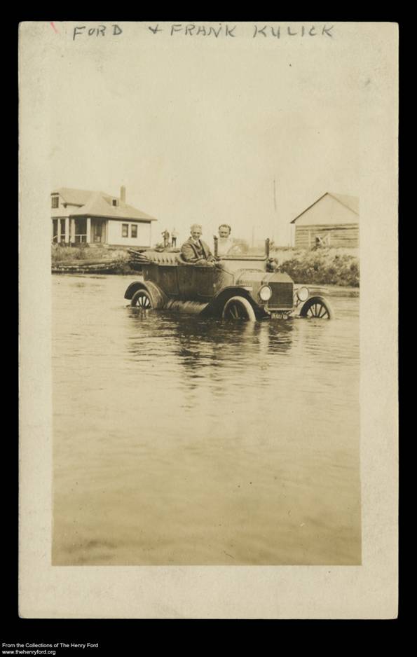 Henry Ford and race car driver Frank Kulick seated in a Ford Model T during a flood, circa 1916 (THF97215).