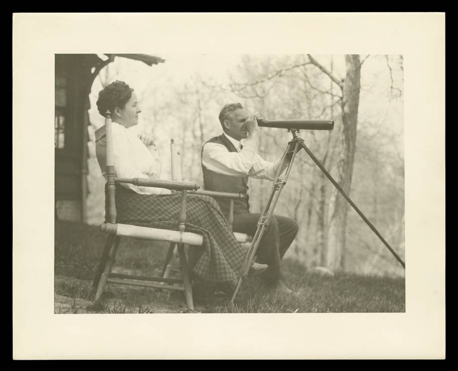 Henry and Clara Ford birdwatching at “the bungalow,” the future site of their Fair Lane estate, Dearborn, Michigan, 1910-1915 (THF96013).