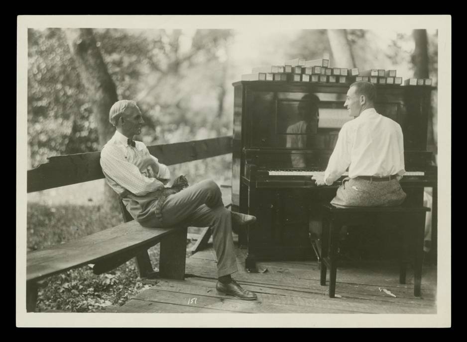 Henry and Edsel Ford with a player piano during a camping trip in Maryland, 1921 (THF96578).