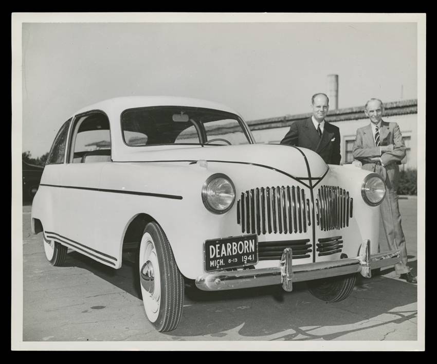 Henry Ford and chemist Robert Boyer unveiling the “Soybean Car,” a prototype with a plastic body, Dearborn, Michigan, 1941 (THF98874).