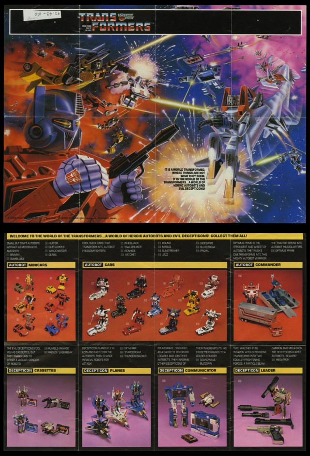 Introduced in the United States in 1984, the Transformers have been among the most popular toy lines ever since. They were robots who could change into sportscars, jets, spaceships, and dinosaurs. The appeal was obvious. Cartoons and comic books established a storyline about the heroic Autobots protecting Earth from the evil Decepticons. The above sales brochure was included with boxed Transformers toys in 1984.