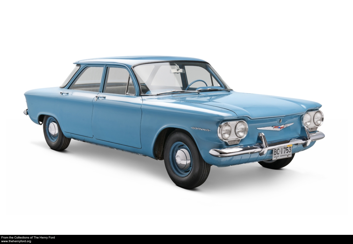 Chevrolet took the engine to a place it had rarely been in an American production car – the rear. Much of the motor is hidden by a metal shroud directing air flow from the deck louvers. There are two carburetors, one for each cylinder bank, connected to a single air cleaner at center. Later models increased trunk size up front by moving the spare tire to the engine compartment.