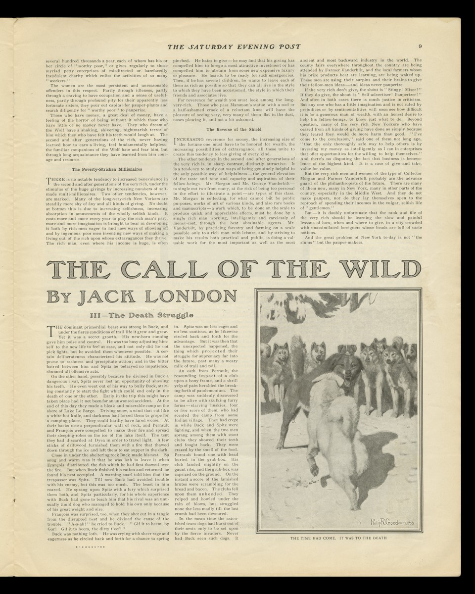 The Call of the Wild was first published in The Saturday Evening Post, a popular weekly magazine that featured a variety of content including articles on current events, editorials, illustrations, cartoons, poetry, and fiction. The magazine paid Jack London a sum of $750 for his story, the equivalent of almost $20,000 today. The Call of the Wild was published in five consecutive issues from June 20, 1903 to July 18, 1903. The first two of these issues are held in the collections of The Henry Ford, including the initial issue which features The Call of the Wild on the cover.