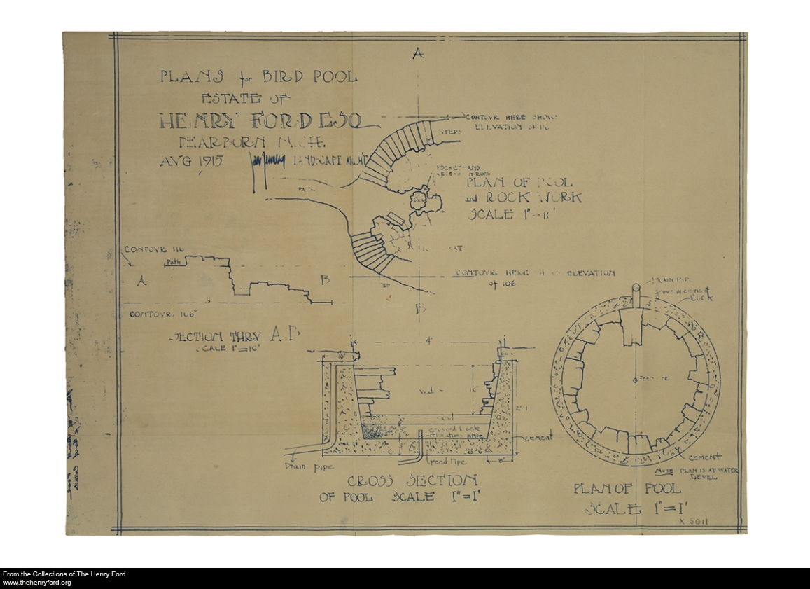 Jens Jensen (1860–1951) was a Danish-born landscape architect who did a large amount of design work for the Ford family and Ford Motor Company. This included Ford Motor Company pavilion landscaping for the 1933–34 Chicago World’s Fair, landscape design for multiple residences of Edsel Ford, and complete landscaping for Fair Lane, the Dearborn estate of Henry and Clara Ford. We’ve just digitized 29 blueprints from the Jens Jensen Drawings Series showing planting plans, grading and topographical plans, and water feature plans for the Fair Lane estate, such as this one for a bird pool. View all related material in our digital collections.