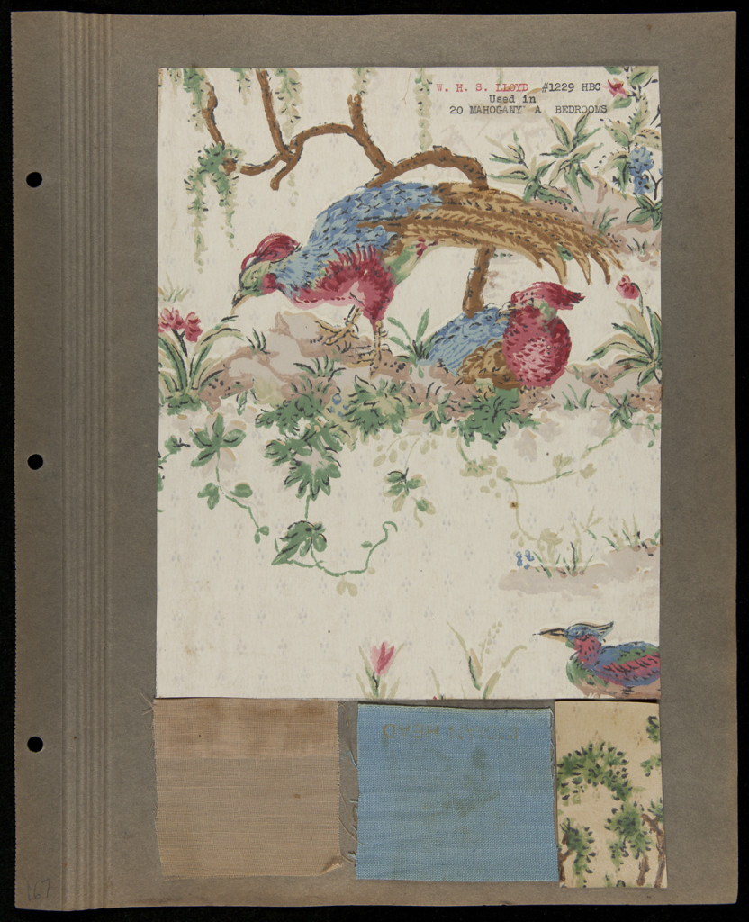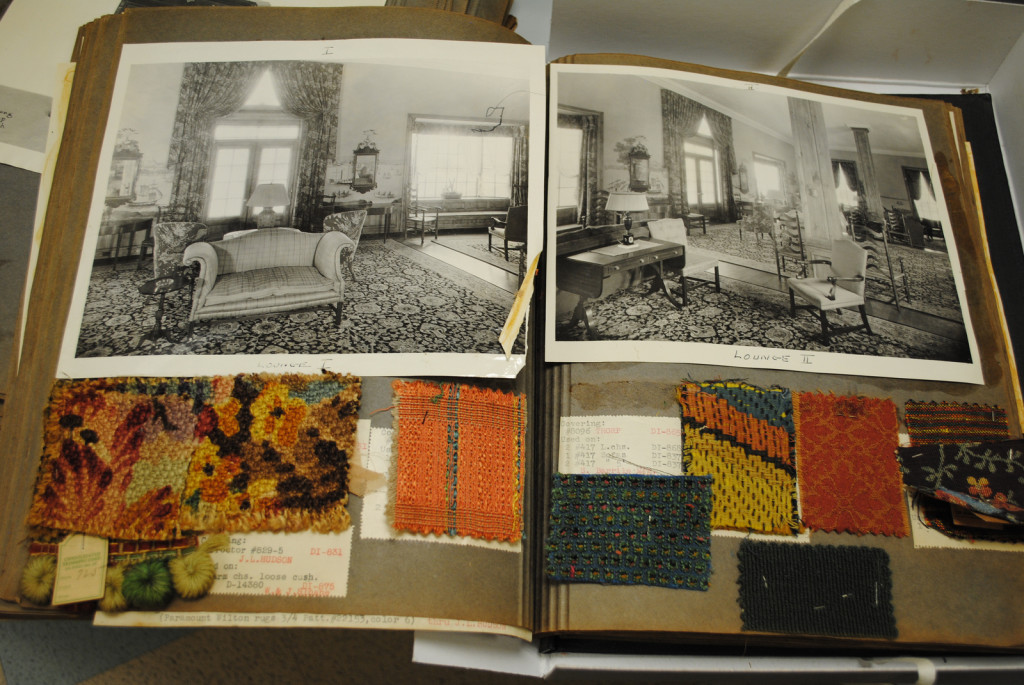 In the late summer of 2012, the Museum’s Chief Registrar brought a large loose-leaf scrapbook containing a variety of photos, ledger pages, correspondence, fabric samples, design renderings, and floor plans. All of the individual samples were carefully identified as to their location in the building, the name of supplier, and item or model number. Several pages are accounting price lists for each room. The samples were meticulously arranged, most as overlays, and glued into the cardboard pages. Nearly all of the glue on the samples had dried out over the decades and the samples were loose