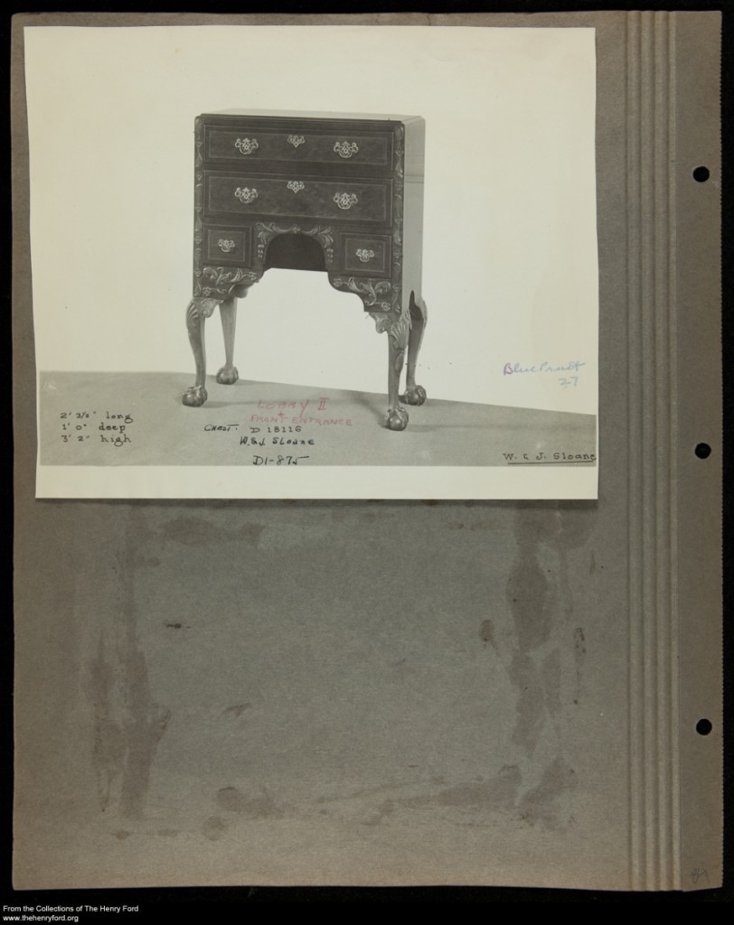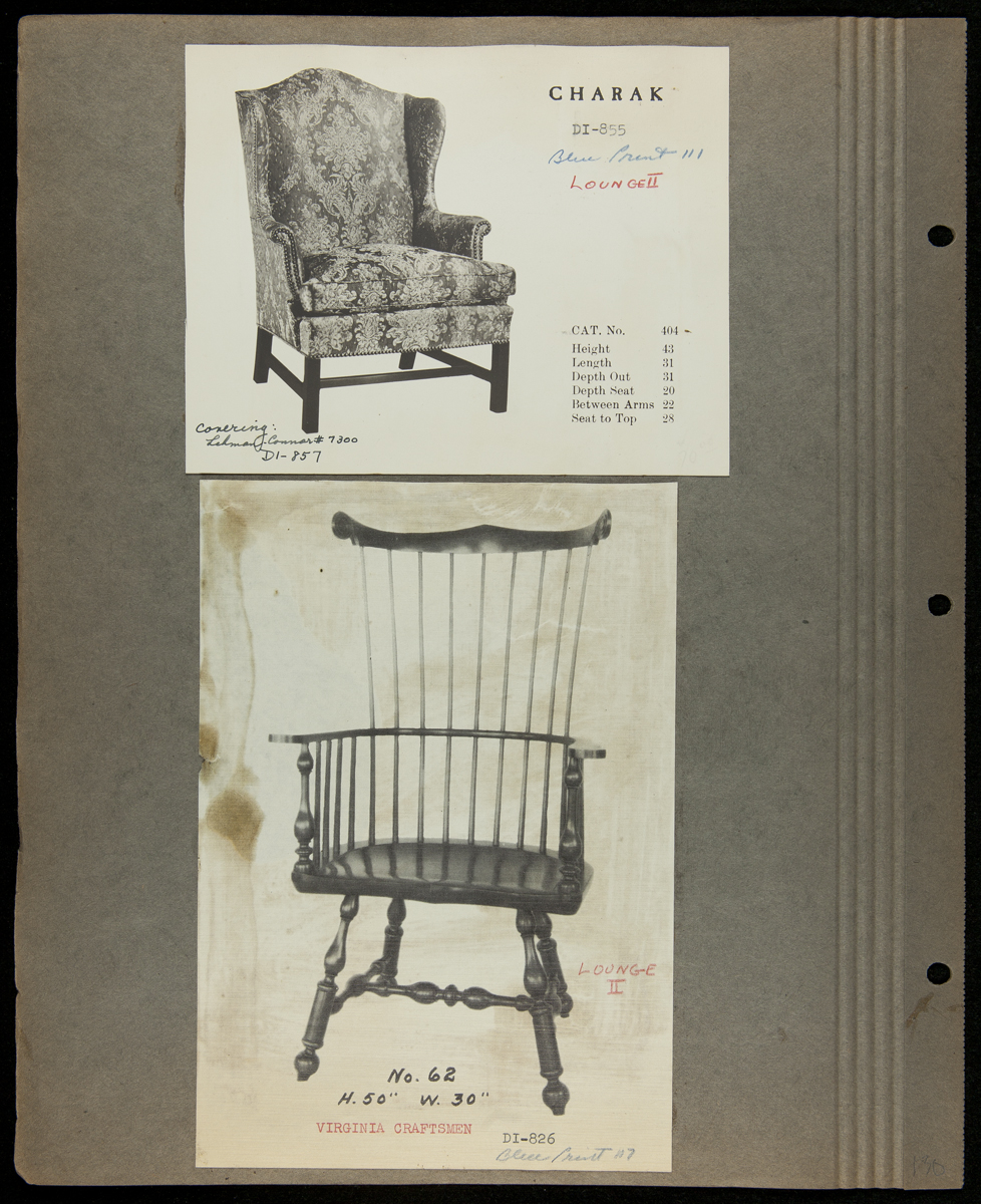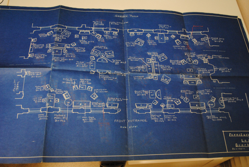 Even after a cursory examination it was clear that this was a careful documentation of every aspect of the furnishings to the smallest detail. Over time, the pages were shuffled out of order, making a clear examination nearly impossible. Nevertheless, our Registrar believed that this scrapbook documented the original furnishing plan of the Dearborn Inn.