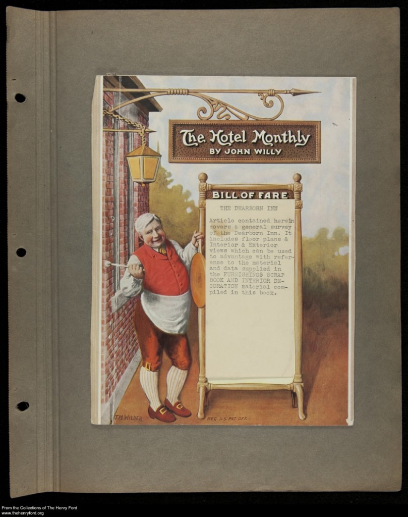 Possibly the most interesting item included is found on the second page, following the index: A bound copy of the trade publication Hotel Monthly from August 1931, includes a feature article on constructing and furnishing the Dearborn Inn. The index describes that it “contains valuable reference material”. The article goes into great technical detail on the construction, emphasizing the modern features found in the inn.