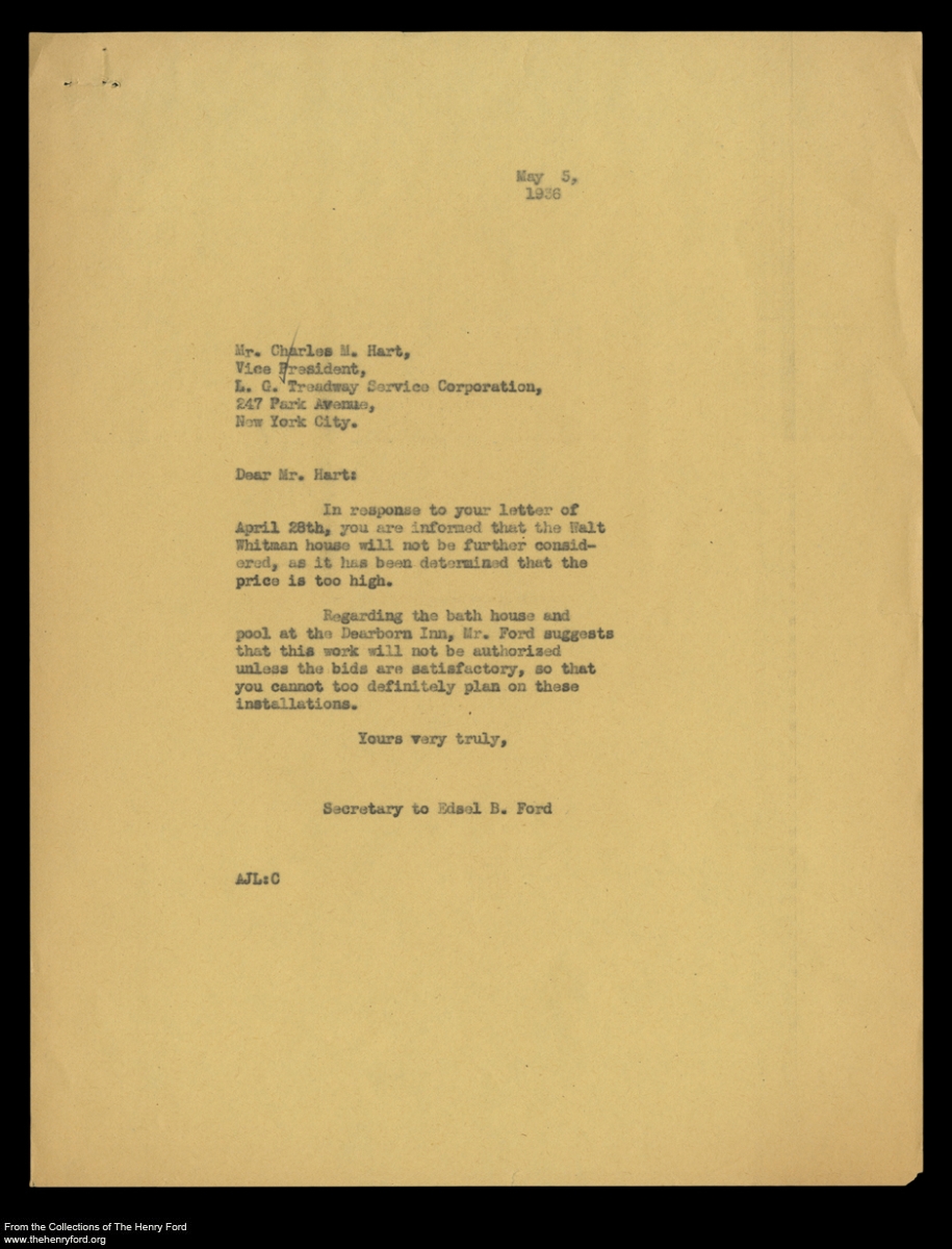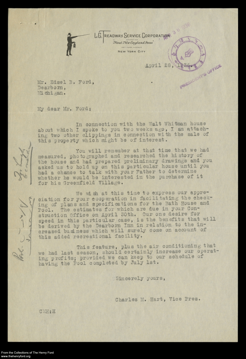 In the first piece, I discussed the unique nature of the Dearborn Inn, intended as an airport hotel and as a “front door” for visitors to our campus, Ford Motor Company and the Dearborn community. What I did not address was who conceived of the Inn and oversaw the project to its fruition. That individual was Edsel Ford. While it is generally acknowledged that Edsel Ford was a pivotal figure in the management of the Ford enterprise, individual achievements are rarely accorded to him. In the case of the Dearborn Inn, it is generally considered to be the conception of Henry Ford. While researching the scrapbook, I ran across reminiscences in our archives of Ernest Gustav Liebold (1884-1956), who served as Henry Ford’s executive secretary and financial manager. Mr. Liebold oversaw nearly all of Henry Ford’s business outside of Ford Motor Company. Mr. Liebold categorically states that the idea for the Dearborn Inn came from Mr. Edsel Ford. He continues to briefly discuss the construction of the Inn, specifically the interaction of architect Albert Kahn’s office with the Ford organization. Finally, Mr. Liebold states the following: