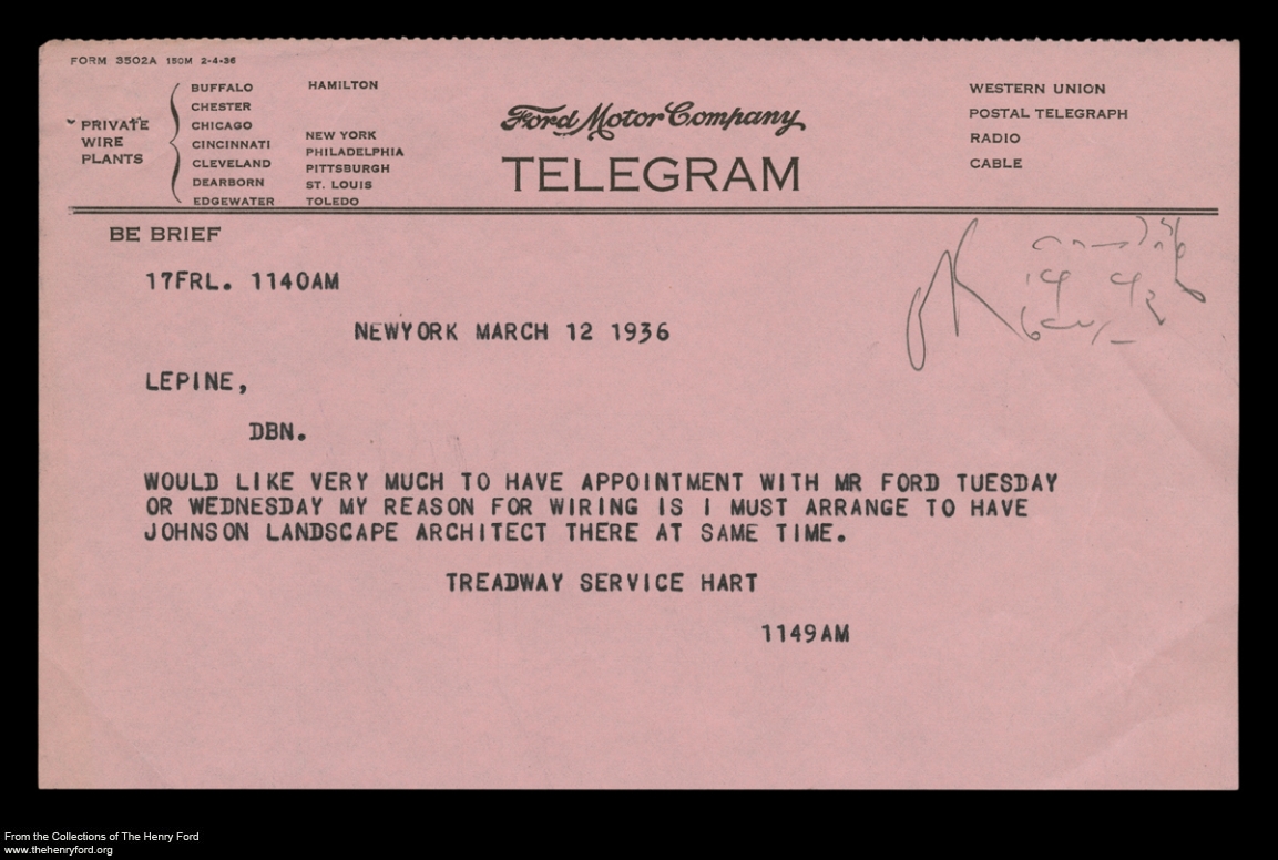 By late 1935, Edsel Ford, in consultation with the L.G. Treadway Company of New York City, was hard at work on a plan to add additional accommodations. A promotional brochure published by Treadway sums up the need for expansion: