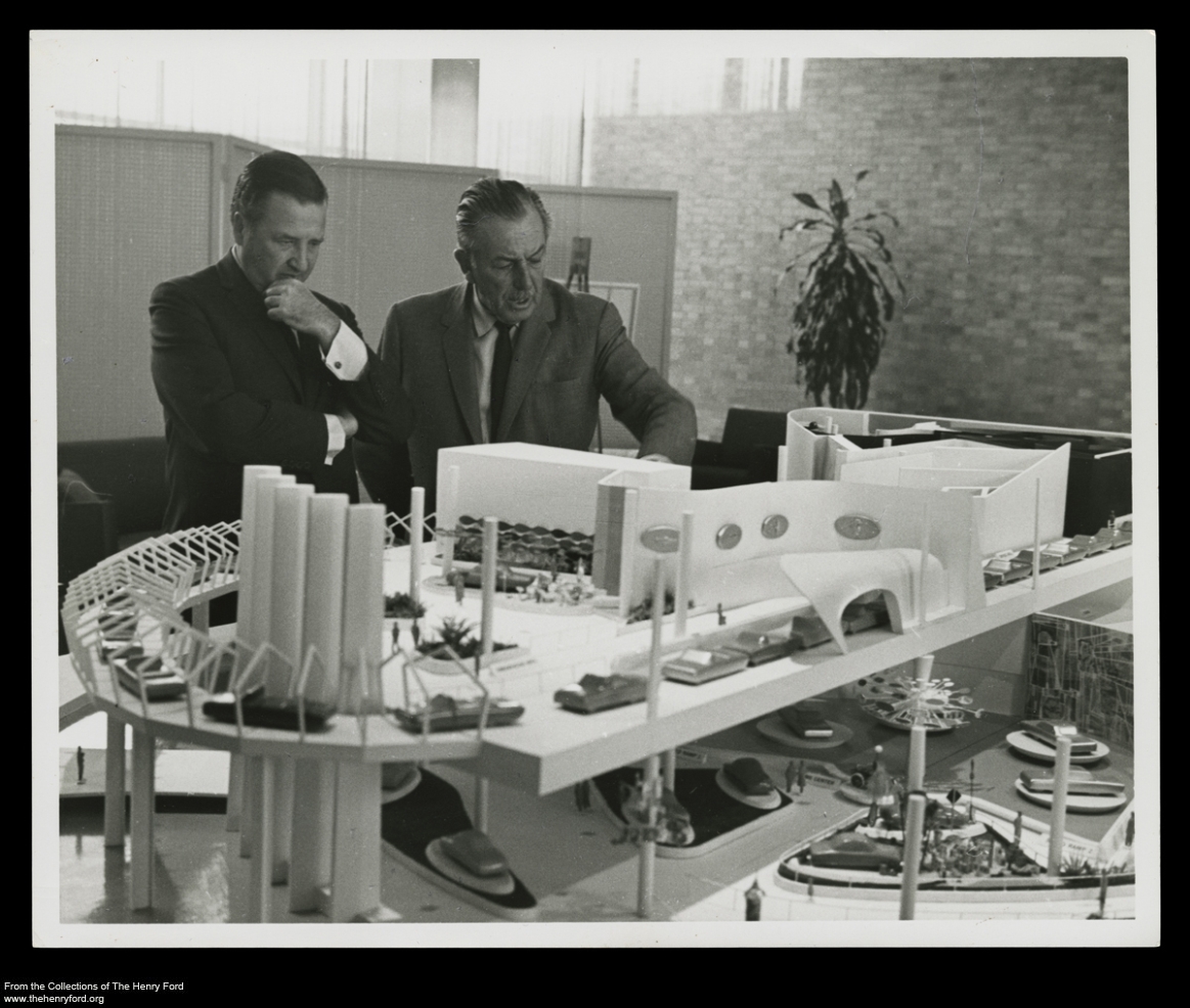 Ford recognized that Disney represented not only “the greatest pool of creative talent available” but also had years of experience with crowd movement and control. Indeed, when Walt Disney brought in architect Welton Becket from Los Angeles to design the Ford pavilion, he directed Becket to provide space for two simultaneous shows, queuing areas, and product displays—allowing for a capacity of 4,000 guests per hour. Ford Motor Company executives were particularly interested in their pavilion taking on a rotunda form, in keeping with their previous structures at world’s fairs and to commemorate the loss of their beloved, recently-burned-down Ford Rotunda in Dearborn.