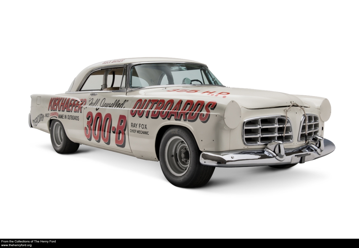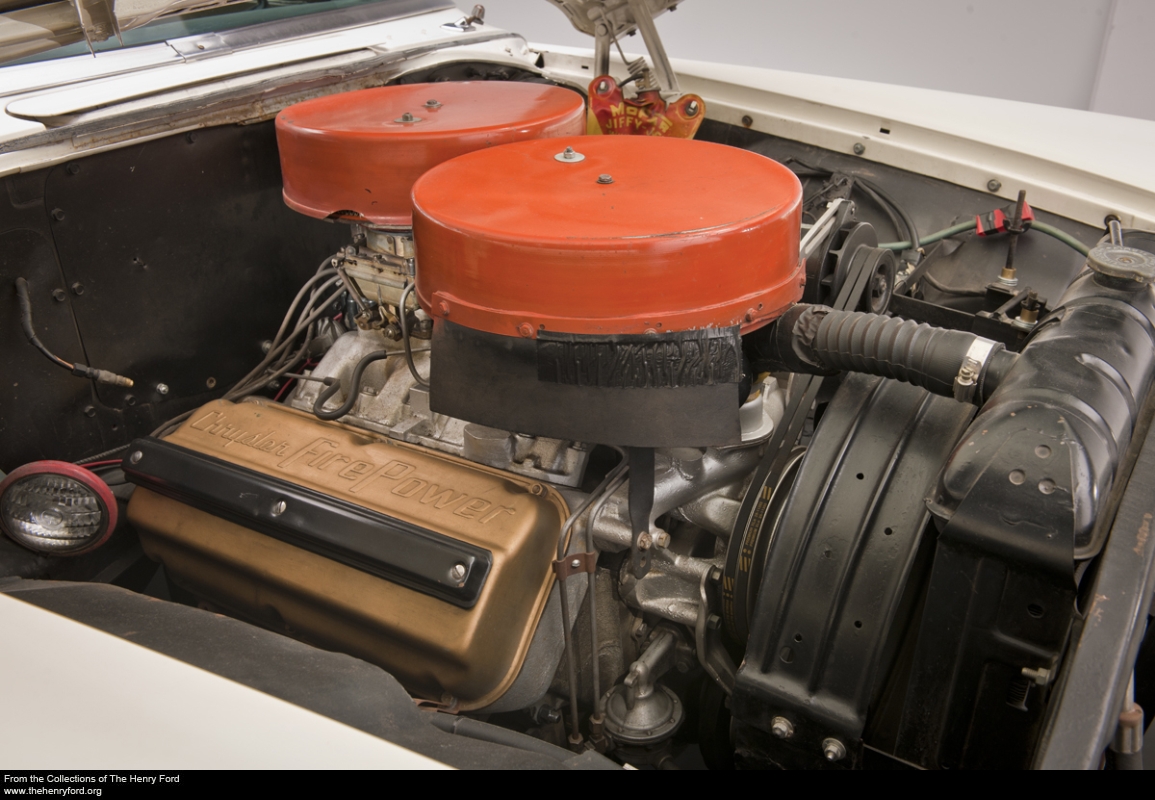 They didn’t call the Chrysler 300 letter series luxury cars “bankers’ hot rods” for nothing. The 1956 300-B’s big V-8 achieved that holy grail of one horsepower per cubic inch. The cars dominated NASCAR, where rules still restricted teams to stock power. Note the cutout in the right wheel well and the nearby spotlight. These modifications allowed the driver to check tire wear through a hole in the firewall.