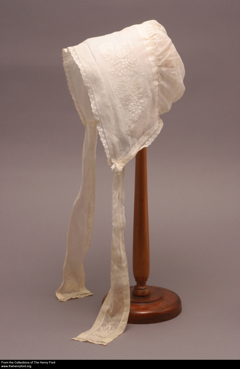 One of the most distinctive features of Greenfield Village is the period-authentic clothing worn by the presenters, all created on site by our Clothing Studio. Many of the designs they create are based on objects from our own costume collection, including clothing, shoes, hats, and other accessories. We’ve just digitized a selection of bonnets, including this delicate 19th century example. See detail shots of two dozen bonnets, ranging from the very simple to the very ornate, in our Digital Collections.
