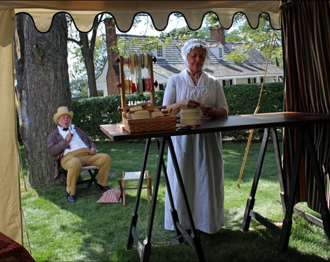 We enjoyed visiting the merchant tents. The millinery was an active spot with many hats to try. There was a men’s hat maker, pewterer, a textiles’ seller and a wax portrait artist.