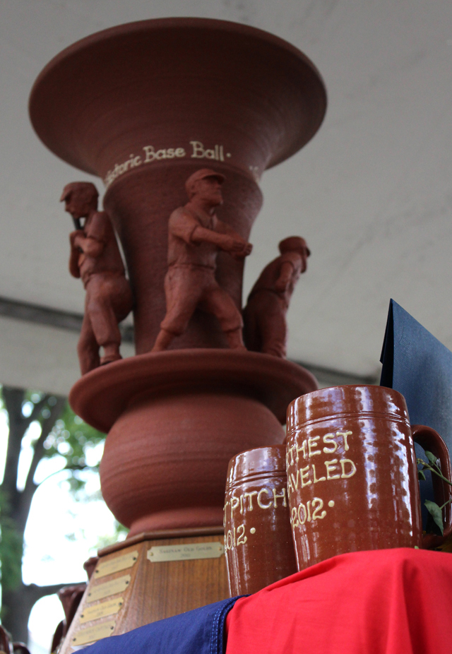 It is, however, a much larger event than just watching the games (though for many visitors, that is enough to keep them entertained). The Dodworth Saxhorn Band plays songs of the 19th century with instruments of the period. Kids can test their skills on the Village Green along with a hands-on display of the game of cricket, one of baseball’s forefathers. In recent years, there was a pop-up exhibit featuring artifacts, including the original rosewood bat won by the Unknowns in 1867, as well as modern trophies created by the Liberty Craftworks pottery team for presentation to that year’s winning teams.