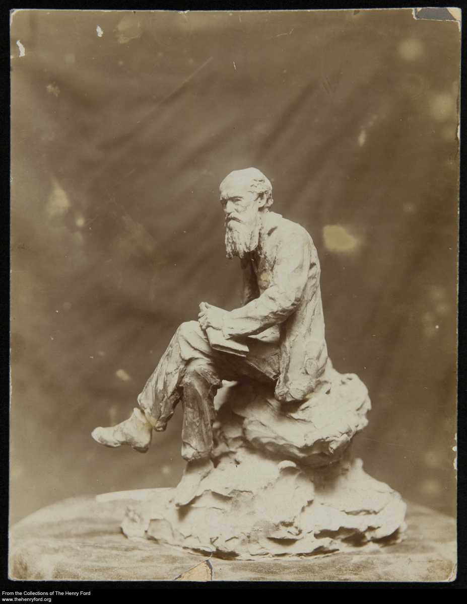 John Burroughs (1837–1921) was an American naturalist who wrote frequently and with a literary sensibility on nature and the environment. He joined the Vagabonds, and as a result took a number of camping trips with Henry Ford, Thomas Edison, and Harvey Firestone. Henry Ford also provided his friend Burroughs with multiple Ford vehicles, including a Model T touring car, to assist him in his nature studies. We’re currently digitizing selections from our collections related to Burroughs, such as this photograph of a sculpture of Burroughs created by C.S. Pietro. You can see Pietro working on what appears to be the same sculpture in another photograph. Thus far, we’ve digitized over 250 photographs, letters, writings, and postcards documenting Burroughs’ life, including his travels, famous friends, and retreats—browse them all on our collections website.