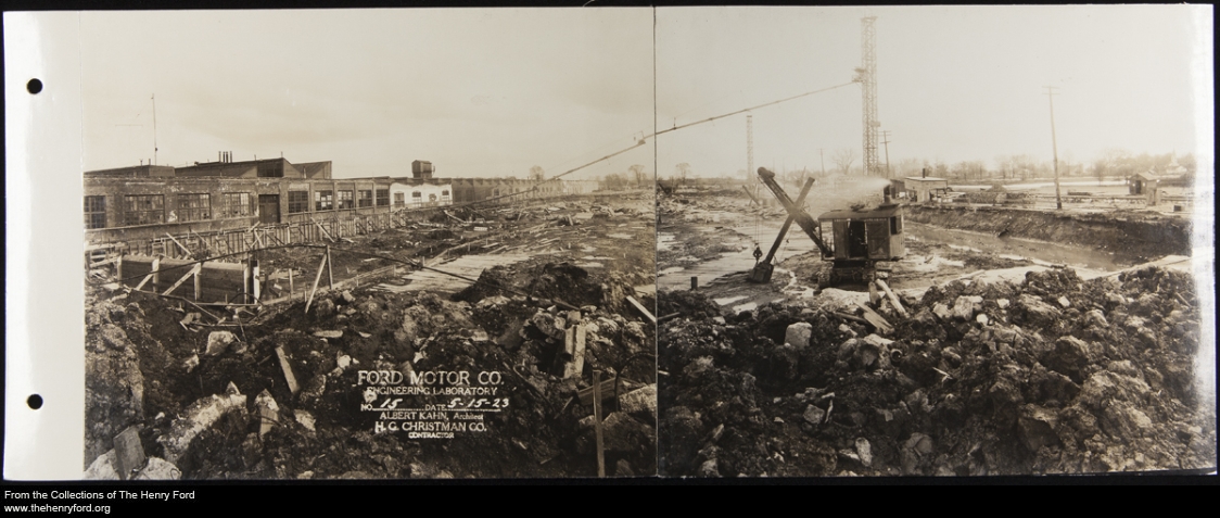 If you’ve ever pulled into the parking lot of Henry Ford Museum from Oakwood Boulevard and looked to your left, you might have wondered what the large building behind the museum is. It has had several names and purposes over the years, but originally housed a new Experimental Department of Ford Motor Company. Designed by Albert Kahn, this engineering building also contained personal offices for Henry and Edsel Ford and a dance hall for Henry’s old-time dances. We’ve just digitized about 100 images of the construction of the building in 1923–24, as well as some later work; this panoramic image shows the state of affairs early on in the construction process. To see more of the construction images and other artifacts relating to the building, visit our collections website.