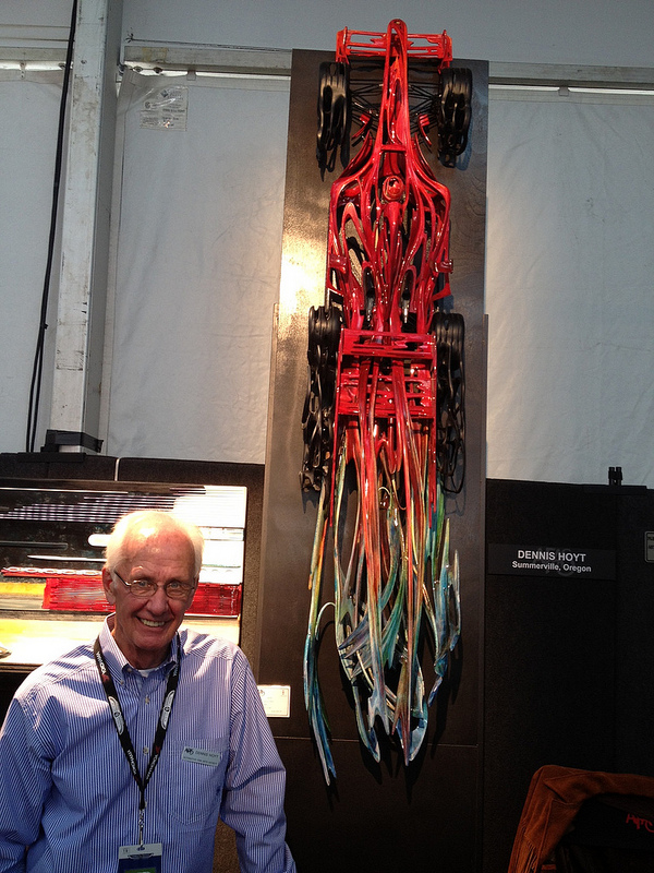 Dennis Hoyt is a wood sculptor who lives in Oregon and specializes in automotive art. He starts with a large trunk from a native basswood tree and carves until, as he puts it "finds a car." At this year's Automotive Fine Art Society exhibit in the Pebble Beach Concours d'Elegance, Hoyt exhibited "Seven," a tribute to Michael Shumacher's seven Formula 1 racing World Championship titles.