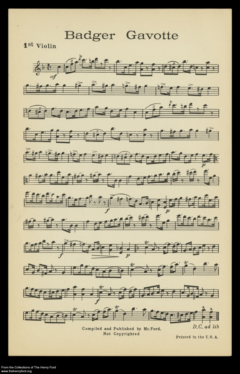The classical violins in the collections of The Henry Ford get around. In 2011 and 2013, we had them CT scanned at Henry Ford Health System; in February 2013, Sphinx Laureate Gareth Johnson played one at the National Day of Courage; and in October 2014, they were featured on Episode 5 of The Henry Ford’s Innovation Nation. Now, thanks to a generous grant from the Michigan Council for the Arts and Cultural Affairs, they are moving out of collections storage and into the Henry Ford Museum, in a display that is planned to go live by February 1, 2015. The violins themselves will be accompanied by a digital kiosk, where visitors will be able to explore additional related artifacts from our online collections. One example of these related artifacts that we’ve just added to our digital collections is the “Badger Gavotte” sheet music for Henry Ford’s Early American Dance Orchestra. Visit our collections website to view other objects related to the Orchestra, dance, and the violins themselves, and plan to visit us next year to see the new exhibit.