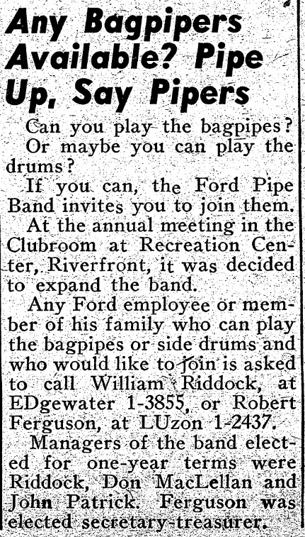 The band took a break during World War II, but some of the members reformed the group when the war was over to continue the piping tradition at Ford with a new set of musicians. The band played in their first post-war major competition in 1948 and continued to place well in competitions all over the United States and Canada. They also played at Ford and Lincoln-Mercury sponsored events, parades, and Scottish games.