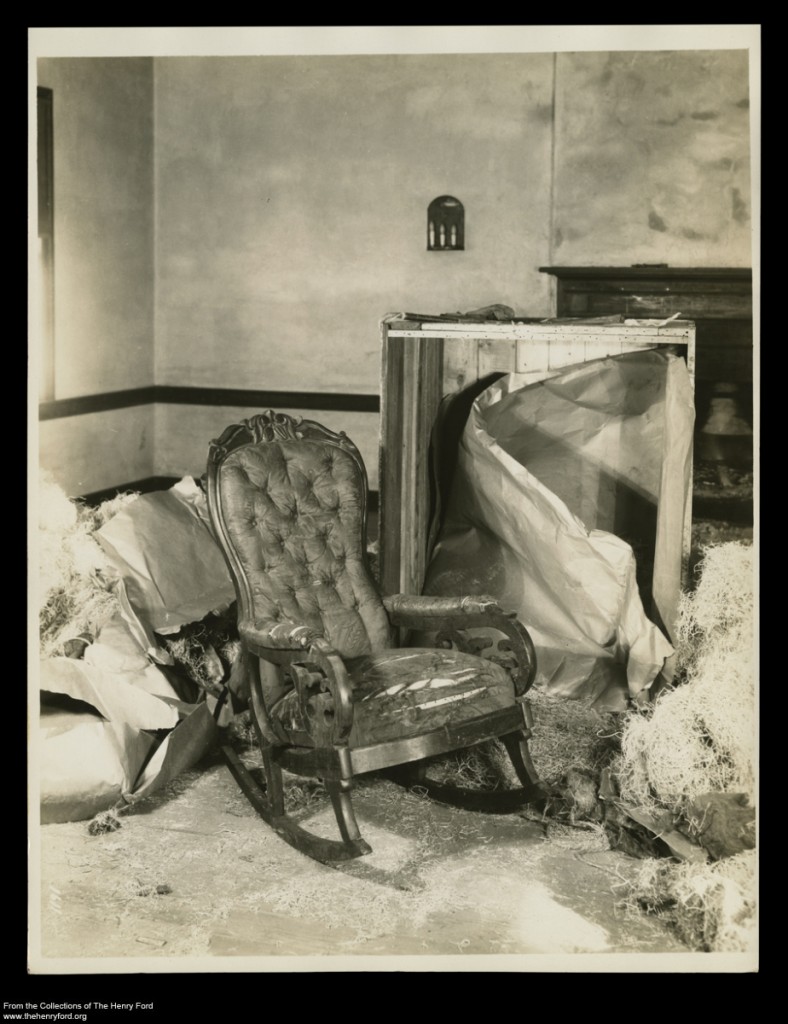 In the late 1920s the chair was sold at auction, having been deemed the property of and returned to the widow of the Ford’s Theatre manager. Henry Ford bought it. At the time, Ford was collecting objects for his museum and historical village. He liked objects associated with great Americans, especially self-made men who came from humble backgrounds. Henry Ford clearly understood the importance of this object—he had the chair’s arrival and unpacking filmed.