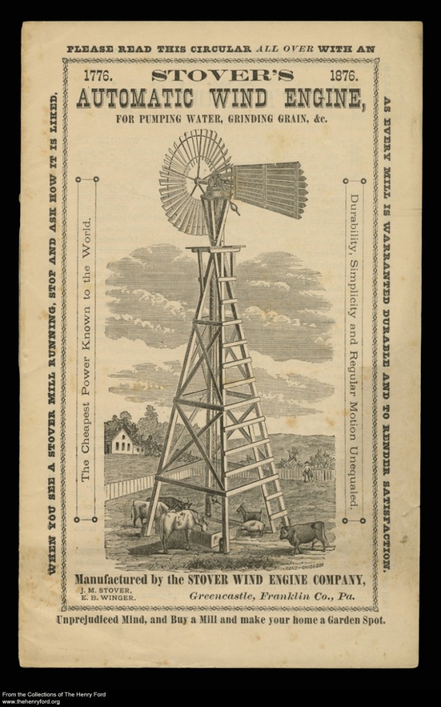 As the story goes, William Ford traveled to Philadelphia for the Centennial Exposition in 1876. William, a farmer from Springwells Township in Wayne County, Mich., took a keen interest in the agricultural displays. One device struck him as particularly useful, a Stover Windmill, or as the Stover Wind Engine Company's advertisement called it, "Stover's Automatic Wind Engine."