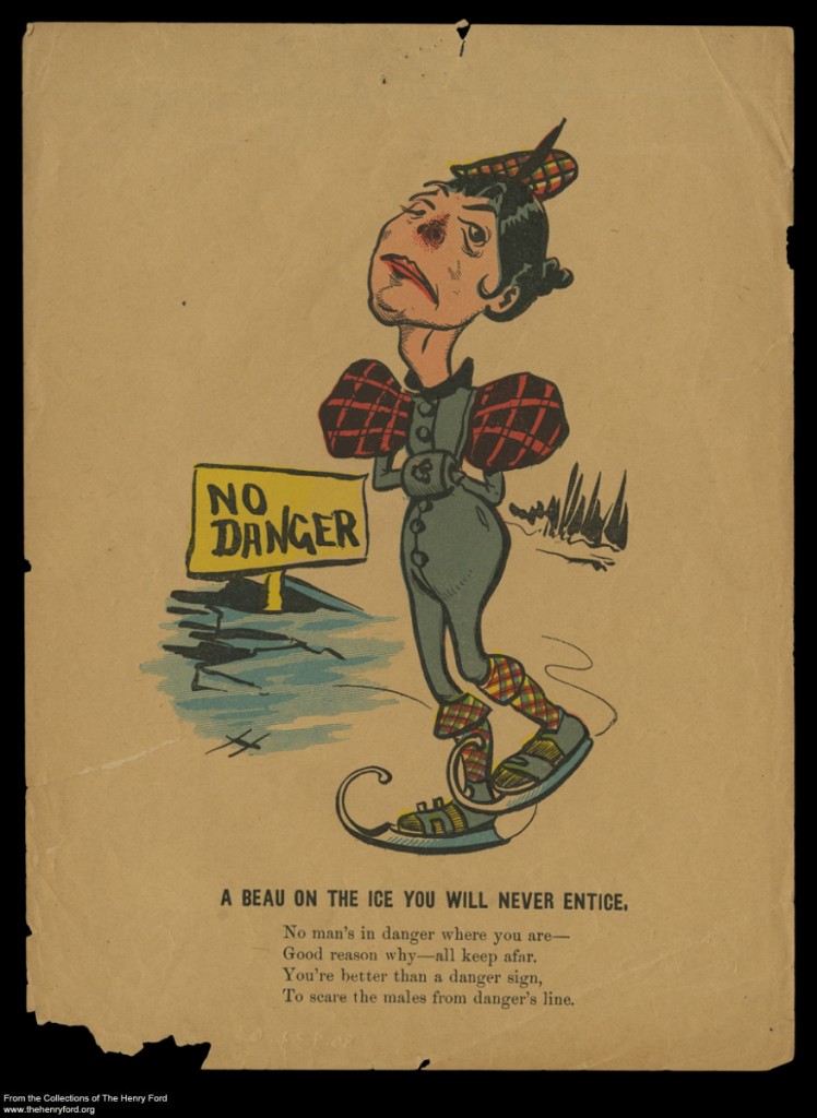 Whether these Valentines seemed comical or hurtful to individual recipients, their larger purpose was to reinforce social norms. Social norms are the standards by which we live, the shared expectations and rules that guide the behavior of people within social groups. These shared expectations and rules are learned and reinforced by parents, friends, teachers, coworkers. Does everyone in your office set their watch around the requisite coffee break? Is it taken for granted that your relatives will hug and kiss each other at family gatherings? Do your neighbors all keep their lawns manicured? In cases like this, don’t you feel pressured into behaving the same way as everyone else? You can be sure that if you’re not doing what everyone else is, people will find ways of making you feel rather like an outcast. This is all part of belonging to a culture and a society. These social norms provide the larger context for these Valentines. Within the atmosphere of a festive holiday, under the cover of humor, senders used these Valentines to critique a person’s behavior when they felt that his or her particular behavior deviated from the norm.