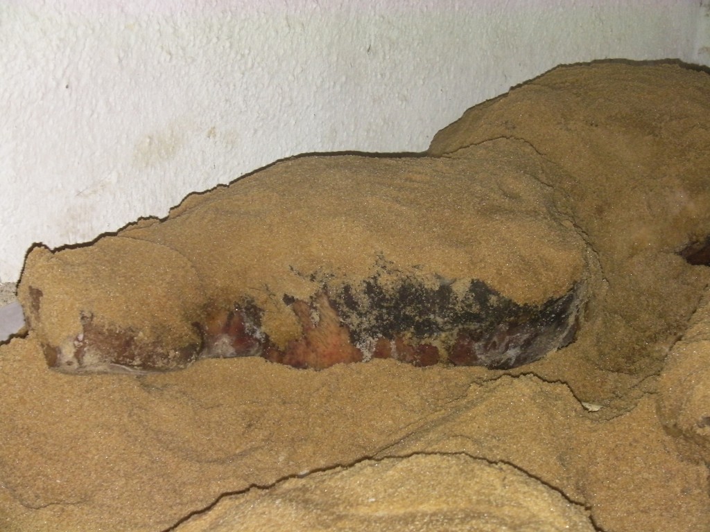 Every day, Firestone farmers rub these cuts of meat with a mixture of salt, sugar and various spices. The salt dehydrates the meat, while sugar prevents it from getting too tough and the spices help to give the meat a nice flavor. It takes several weeks for larger cuts of meat like hams to finish curing. Once a week, old cure is removed from the meat and it is replaced with fresh cure.
