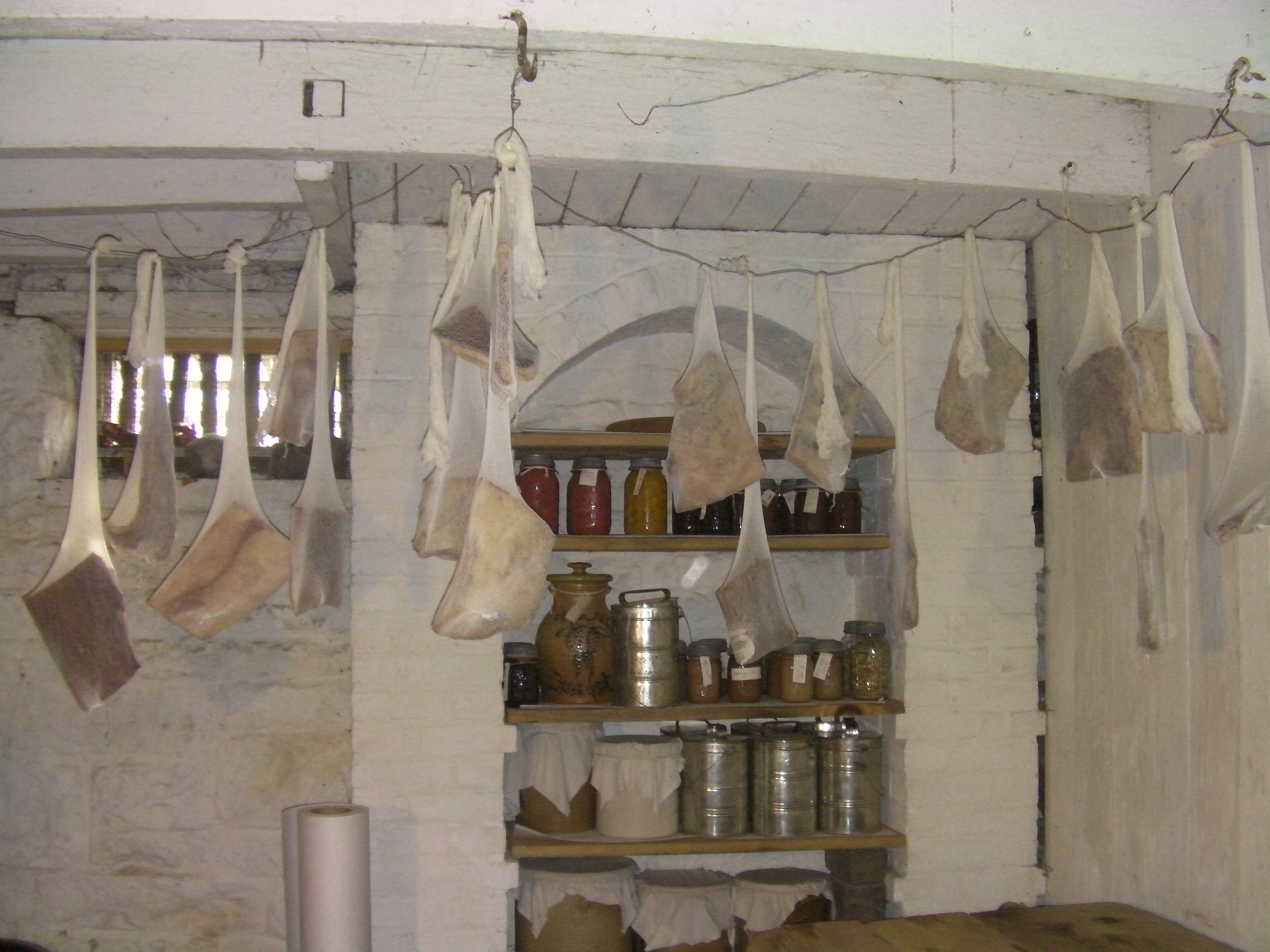 When you visit from April through November, make sure to check out the Firestone home's cellar and cold room - you'll be sure to notice our cured meat hanging from the ceiling in our cold room...and as the year progresses and the time for butchering once again approaches, there will be very little cured meat left hanging in cheesecloth.