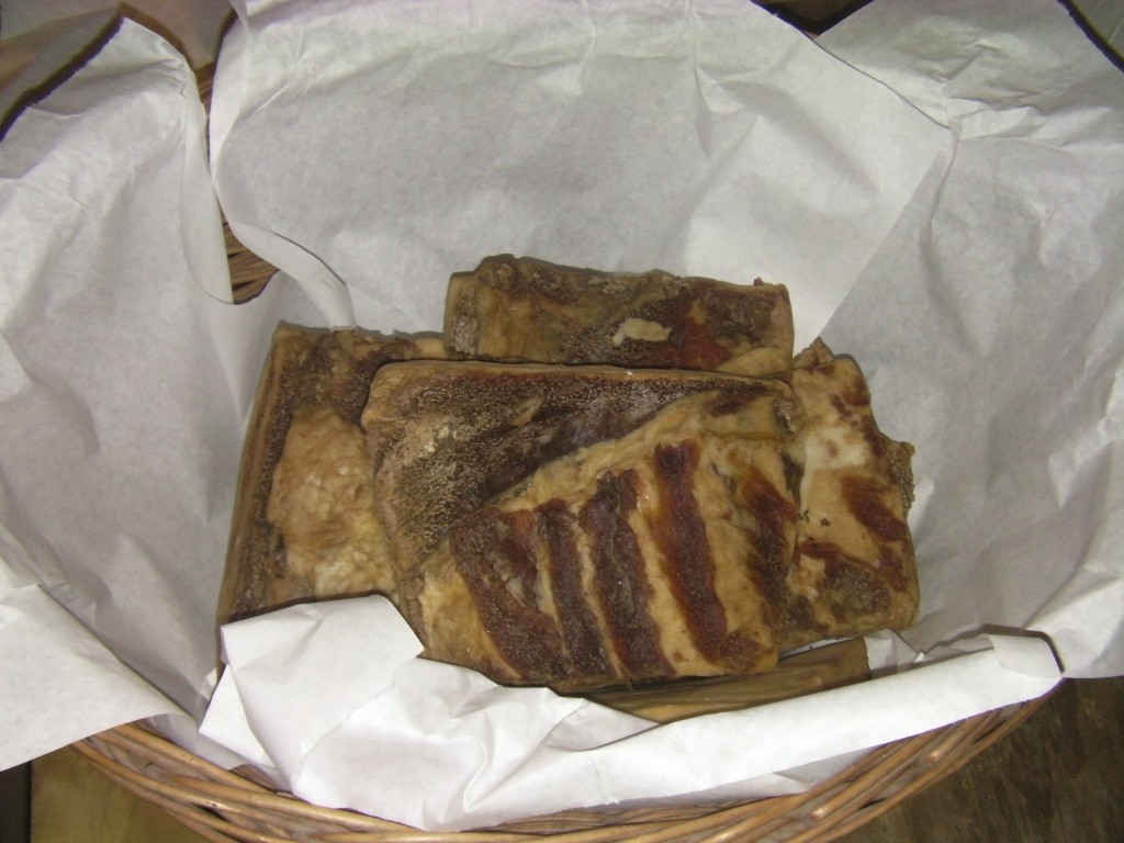 Once the meat is cured, it is wrapped in cheesecloth sacks and hung in the cold room located in Firestone Farm’s cellar.