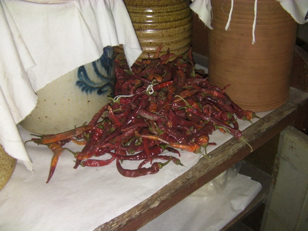 Near the meat are several other foods that were preserved last year, including dried chili peppers, pickles and crocks of sauerkraut as well as jars of tomatoes, pickled green beans, applesauce and more.
