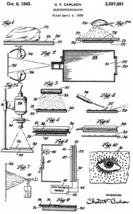 After graduating from high school, Carlson held multiple jobs while attending college, graduating with a BS in Physics from Caltech in 1930. He landed a job as a research engineer at Bell Laboratories, but found himself bored with the menial tasks he was assigned to, and realized that he was clumsy as a lab worker. Sensing that his strengths would be better applied in an “ideas” setting, he transferred into the patent department as an attorney’s assistant at Bell Labs, and then at P.R. Mallory & Co.