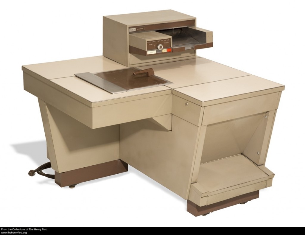 The Xerox 914 was a far cry from the Model A. It was the first fully automatic office copier to use ordinary paper, named for the 9X14-inch paper it made copies onto. Shades of the “Ox Box” can be found in the “scorch eliminator” that accompanied all models of the Xerox 914 copier—a small fire extinguisher (evadingly named for sales reasons), to deal with occasional overheating issues. In 1959, at a demonstration in New York City, one of the two Xerox 914 copiers caught on fire. This didn’t seem to deter buyers, however: within the first three years of production, Xerox had doubled their sales goal of 5000 copiers, selling 10,000. Xerography had a long-winded start, but the success of the Xerox 914 quickly cemented it as the root technology for all modern office photocopiers (and by extension, computer laser printers). The 914 remained in production from 1959 to 1976.