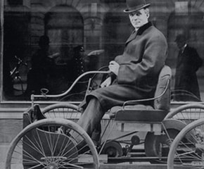 This photograph shows Henry Ford, age 33, with his first gasoline-powered vehicle in October of 1896. He built the Quadricycle with help from some friends in a shed behind a house he and his wife, Clara, rented.